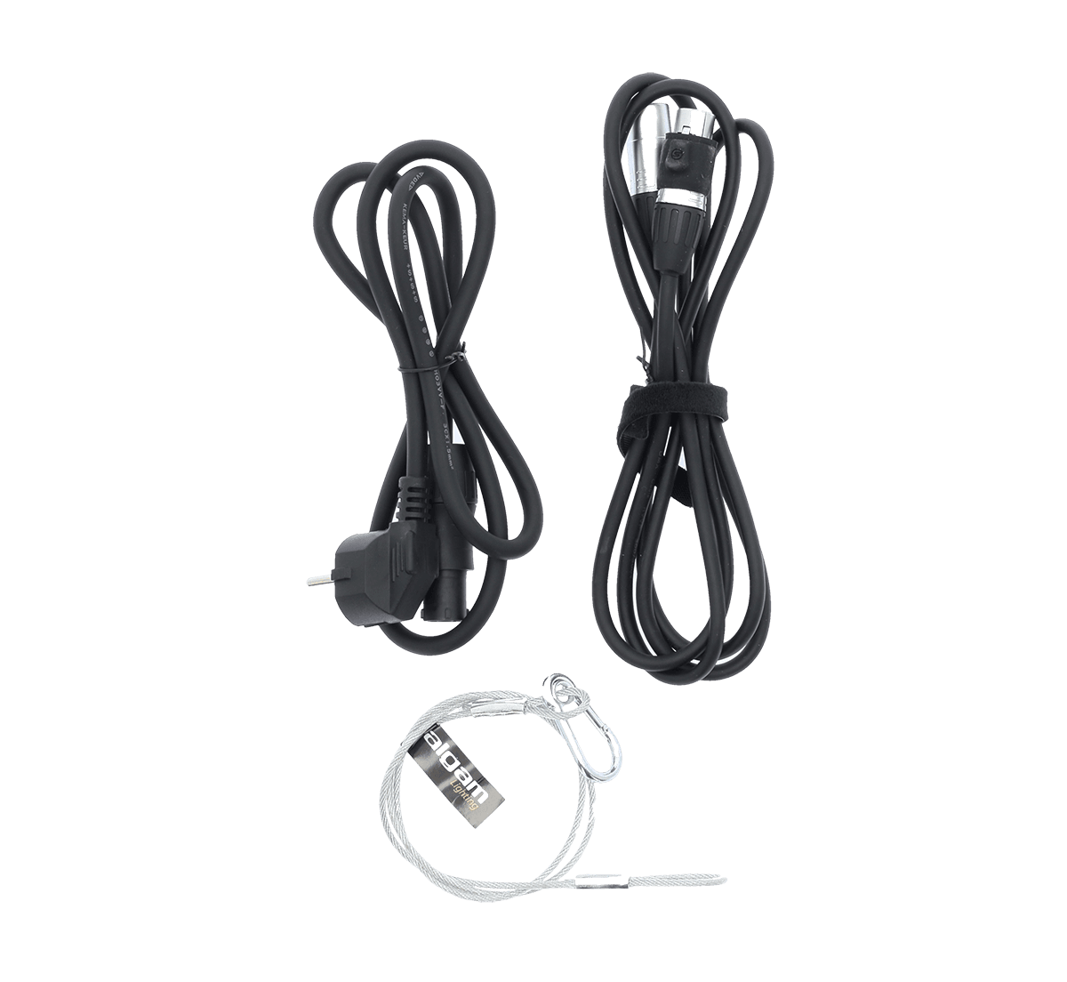 – Geleverd met stroom- en DMX-kabel en hun klittenbandkabelbinder, dubbele ophangbeugel en veiligheidsband