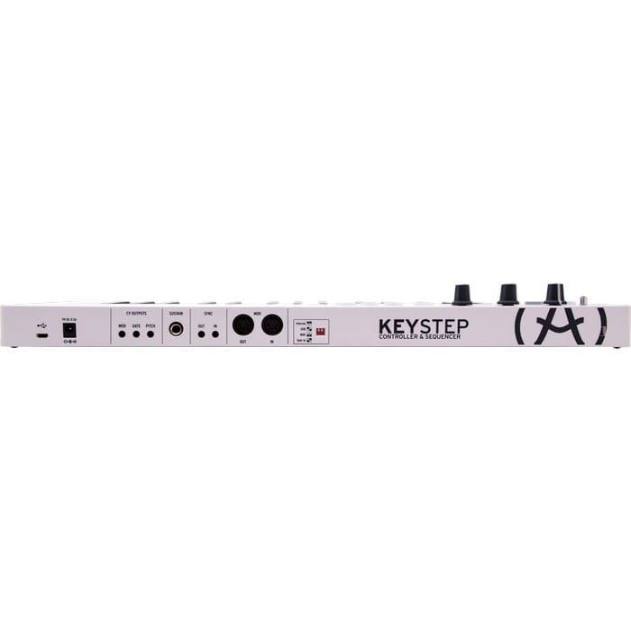 Een stukje verderop vinden we de CV outputs: Mod, gate en pitch. Daarnaast zit een ingang die u kunt gebruiken voor uw sustainpedaal. Verder vinden we een Synch in- en out en uiteraard ook een gewone MIDI in- en out. Als laatste treffen we op de achterkant van de KeyStep nog de zogenaamde ‘Synch mode selectors’. Hiermee kunt u de juiste clock-source selecteren. Kies tussen Internal, USB, MIDI of de Synch Input. Zoals gezegd is de KeyStep een veelzijdig apparaat en veel meer dan alleen een midi-keyboard.