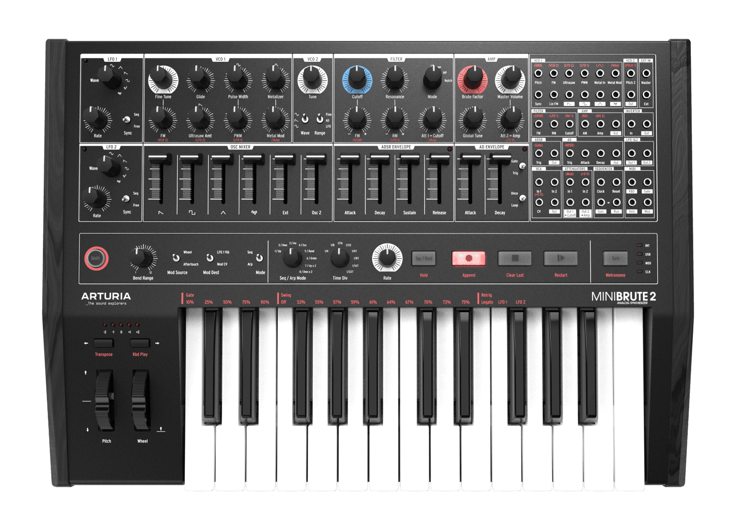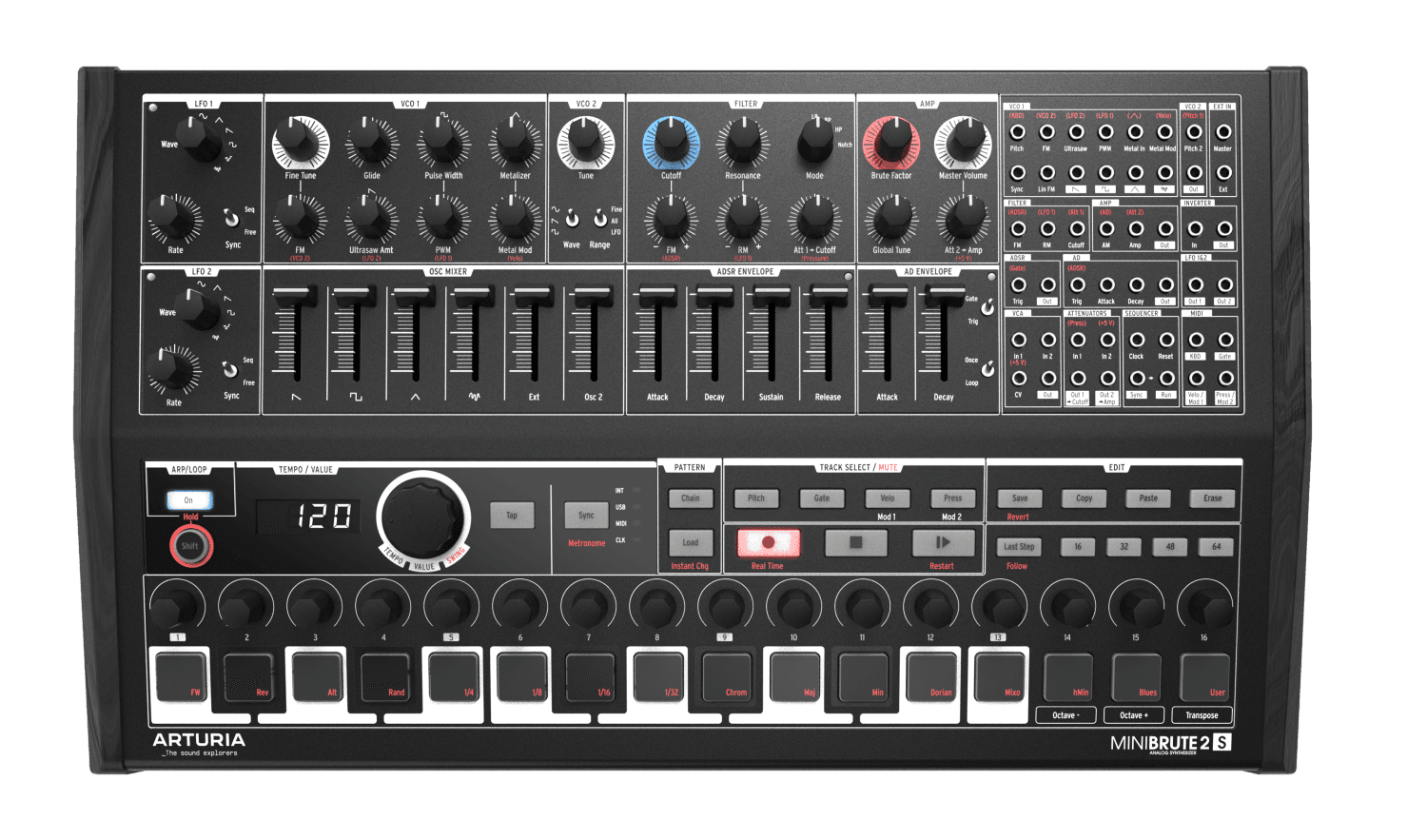 Alle belangrijke kenmerken van de eerste versie zijn intact gebleven in beide opvolgers. Naast een step-sequencer en arpeggiator heb je nog steeds ultieme controle bij het vormen van alle klanken van deze synth. Alle parameters van de twee legendarische oscilators van Arturia zijn volledig naar je hand te zetten. We hebben het dan natuurlijk over de vooruitstrevende looping envelope en de klassieke Steiner-Parker filter. Op de pads na werkt deze 3-laags monophone Minibrute 2S sequencer op dezelfde wijze als de veel geroemde KeyStep controller-editie.