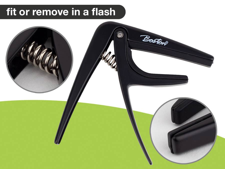 De Boston BC-87 capo (ook wel barréklem genoemd) is een onmisbaar accessoire voor gitaristen, als ook voor ukulele-, mandoline- en banjospelers. Niet alleen transponeert u er de open snaren van uw gitaar mee, maar hij kan ook worden ingezet om de klankkleur op subtiele wijze te beïnvloeden.