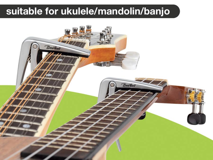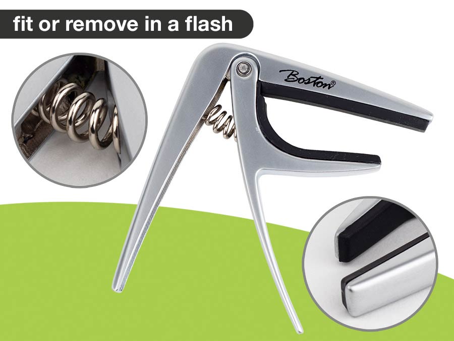 De Boston BC-87 capo (ook wel barréklem genoemd) is een onmisbaar accessoire voor gitaristen, als ook voor ukulele-, mandoline- en banjospelers. Niet alleen transponeert u er de open snaren van uw gitaar mee, maar hij kan ook worden ingezet om de klankkleur op subtiele wijze te beïnvloeden.