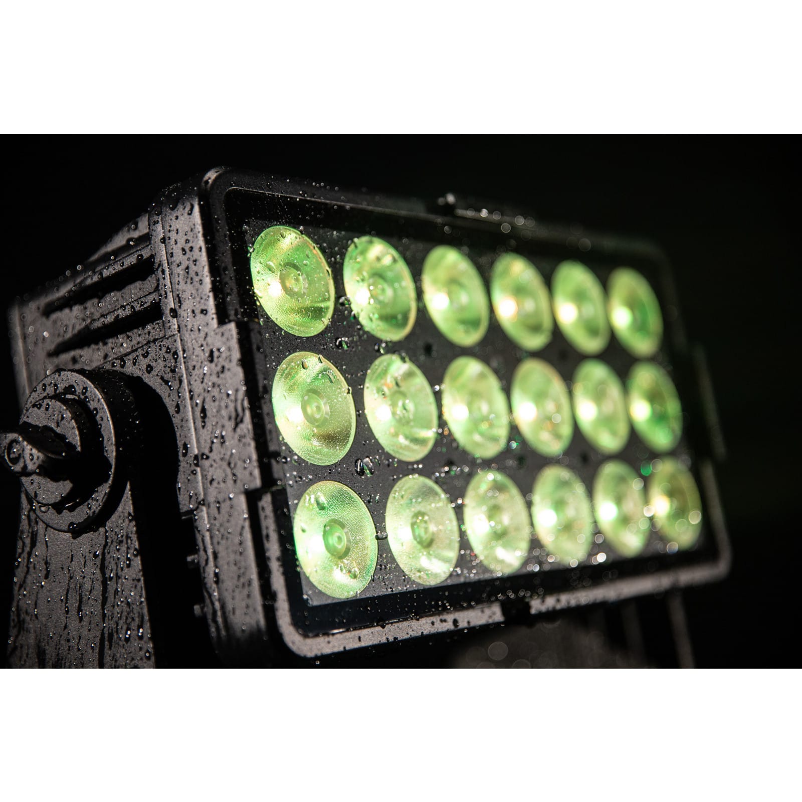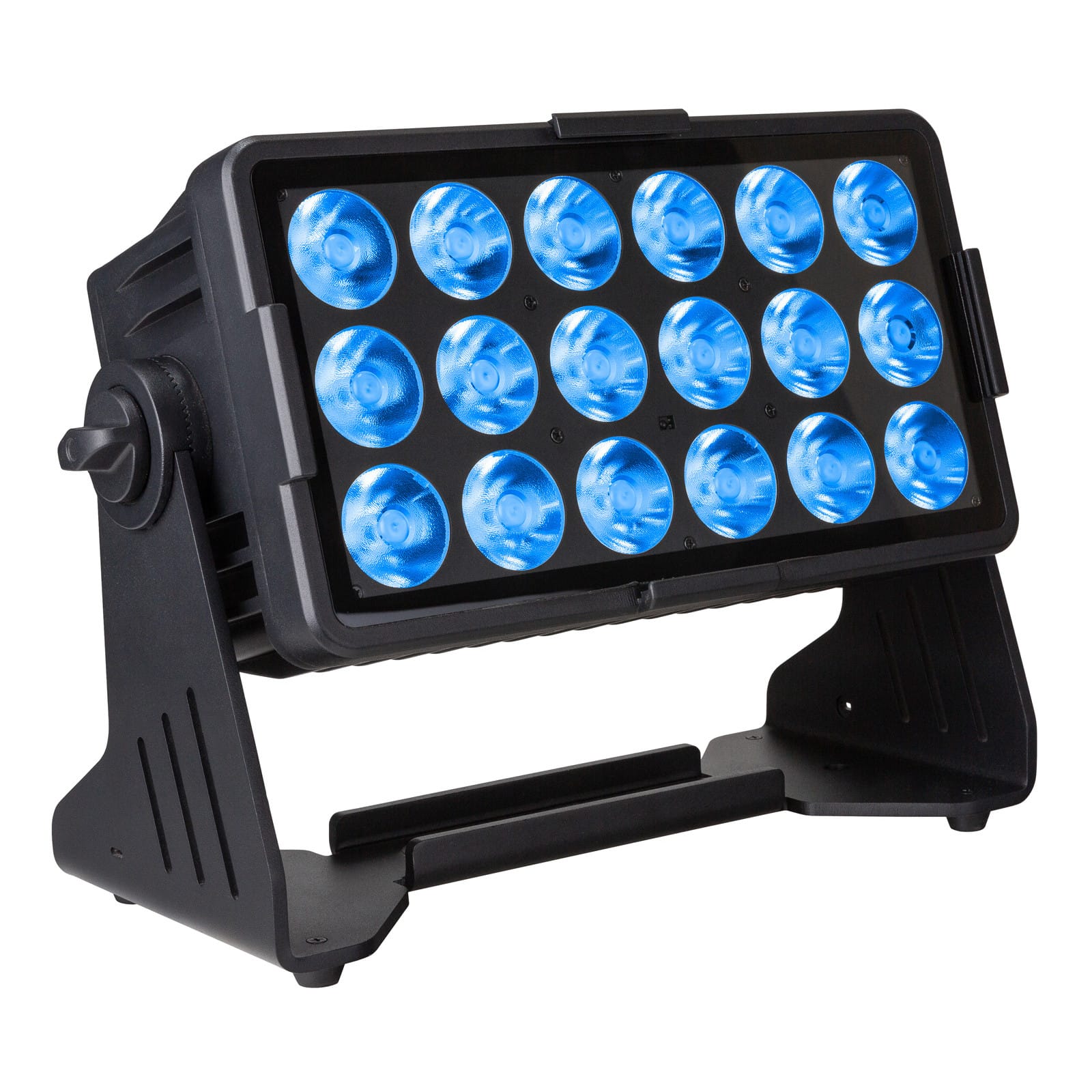 Compacte, krachtige en uiterst veelzijdige batterijgevoede IP65-projector voor buitengebruik, uitgerust met 18x 10W RGBL-LED’s