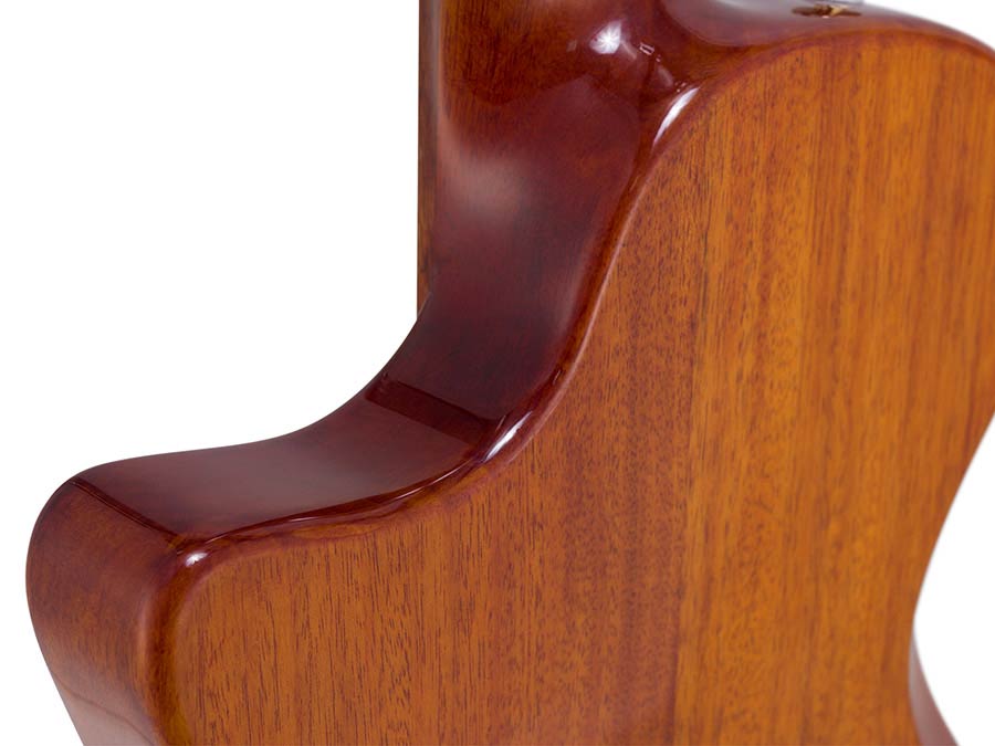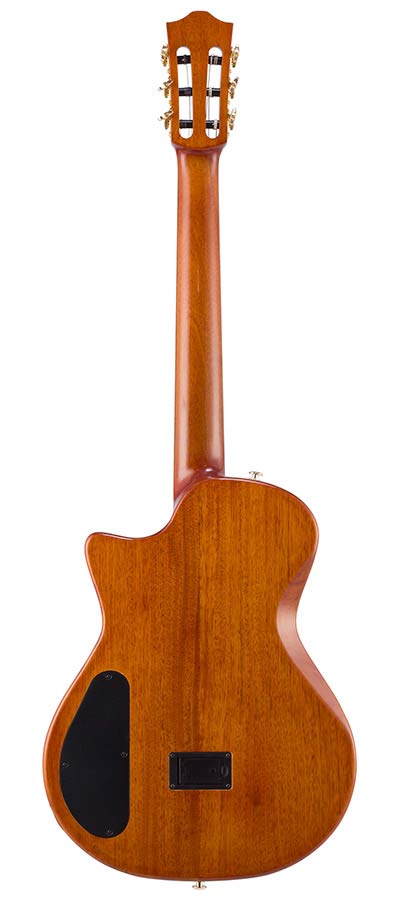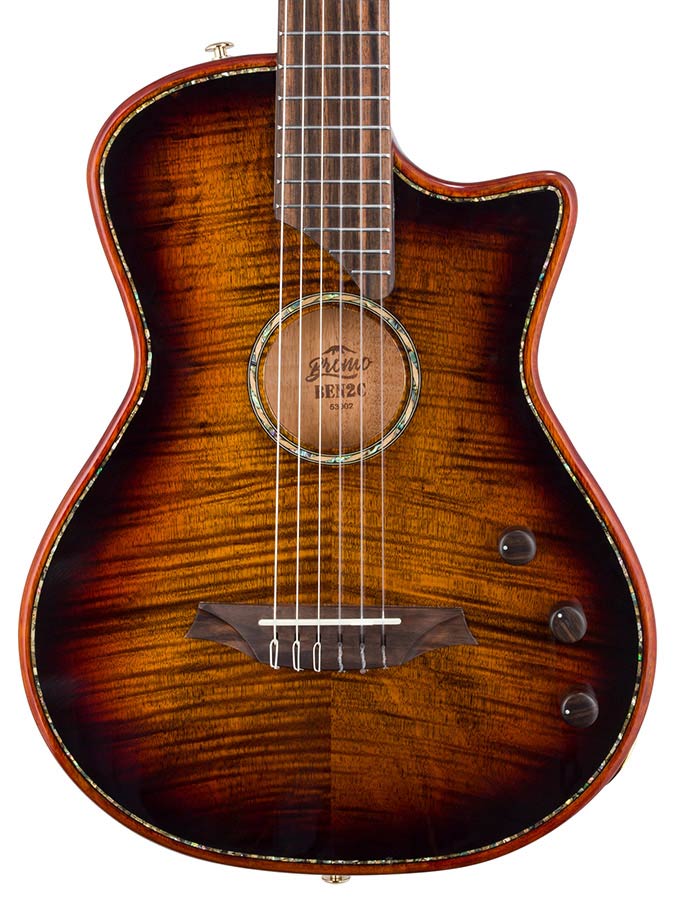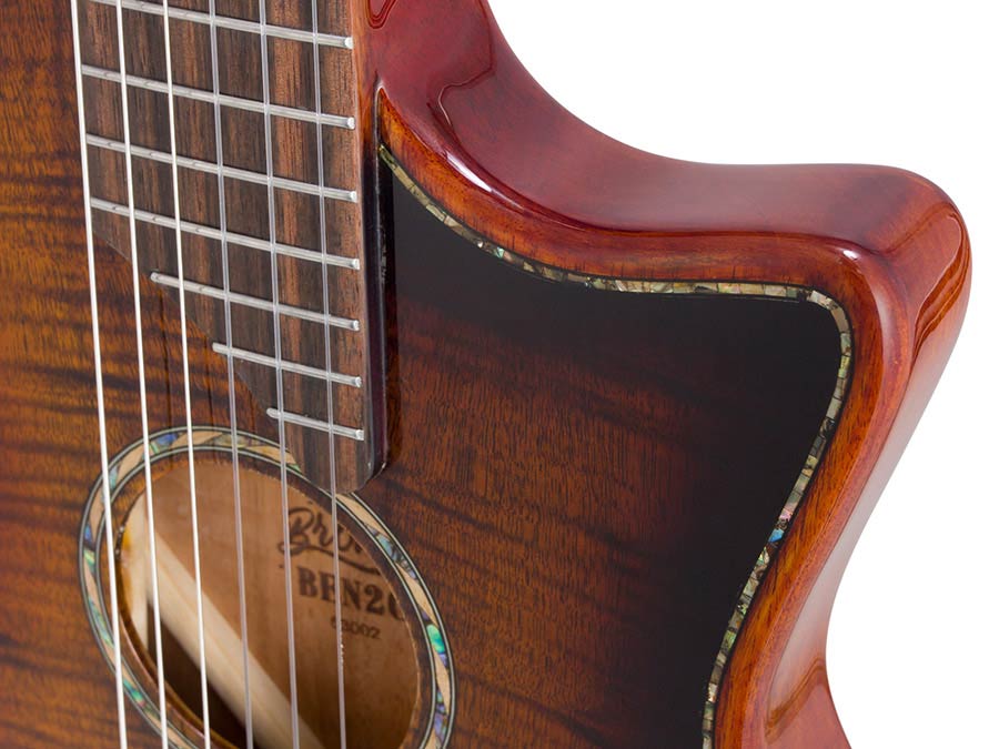 De Bromo BEN2C Fusion Craft Series elektrische nylonsnarige gitaar combineert een klassieke klank met moderne innovatie. Ideaal voor zowel fingerstyle als strummen, combineert deze gitaar nylon snaren met een slanke, ultradunne body van 42 mm (1,65 inch) met een cutaway, ergonomische buikcontour en een vloeiend afgeronde bodyrand, samen met een C-profiel, slanke hals van 48 mm (1-7/8 inch) in combinatie met een innovatieve Comfy Nut en een toetsradius van 400 mm (15,75 inch). Dit ontwerp biedt ongeëvenaarde speelbaarheid voor klassieke gitaristen – iets wat traditionele klassieke gitaren niet kunnen evenaren – en is tegelijkertijd direct vertrouwd voor zowel akoestische als elektrische gitaristen.