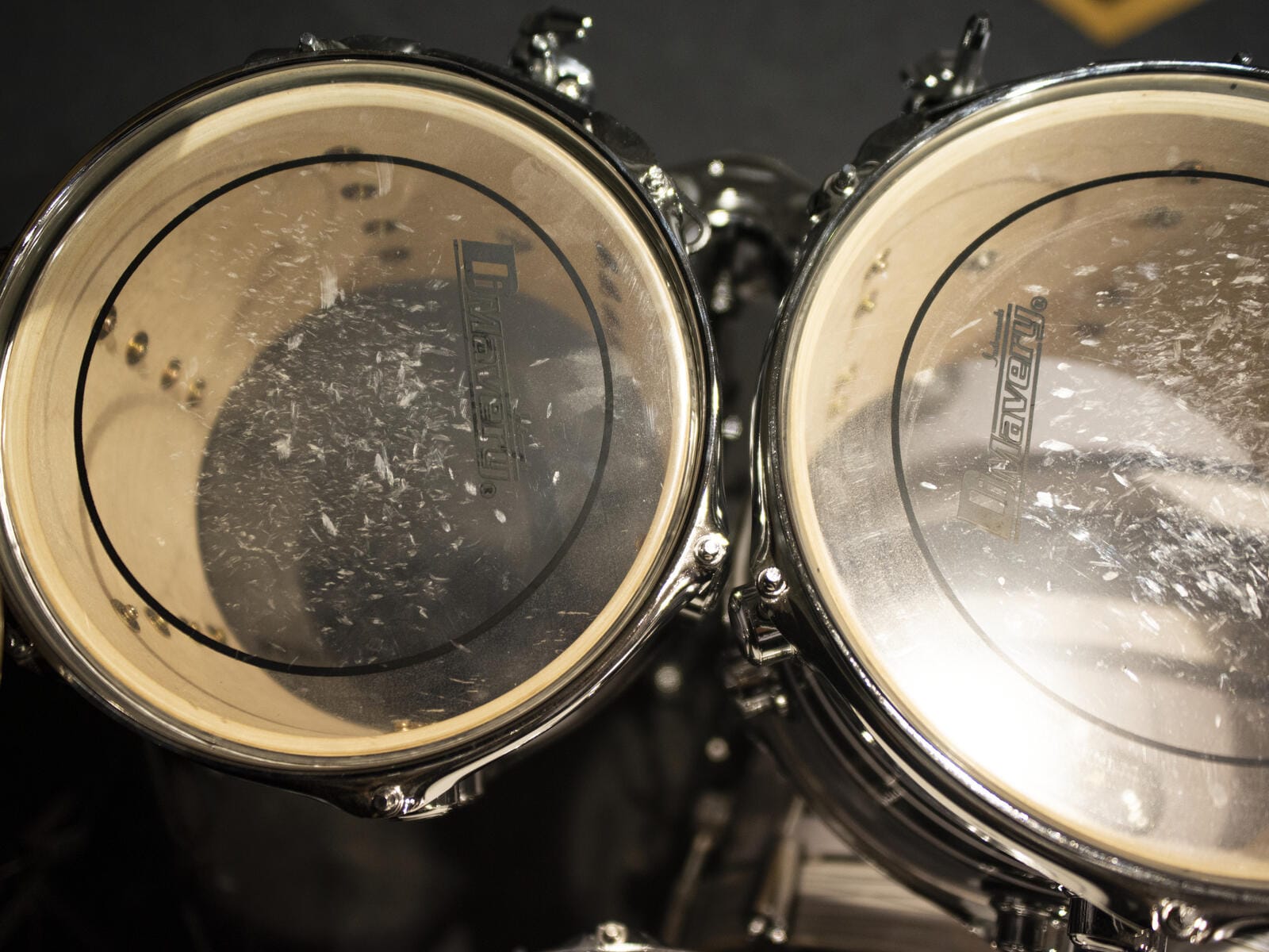 1 x bassdrum, 1 x snaredrum, 1 x floortom, 2 x tomtom, 1 x sleutel, 2 x drumstokken, 4 x standaard