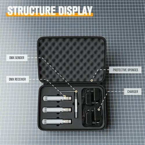 Standaard DMX512 drie-core interface, transmissie zonder vertraging, geen pakketverlies, verzenden en ontvangen als één, automatisch schakelen, driekleurige LED-display werkstatus en parameters, bediening met één toets 126 frequentiebanden automatische frequentiehopping, automatische selectie van storingsvrije frequentiebanden, om de betrouwbaarheid van de communicatie te garanderen.