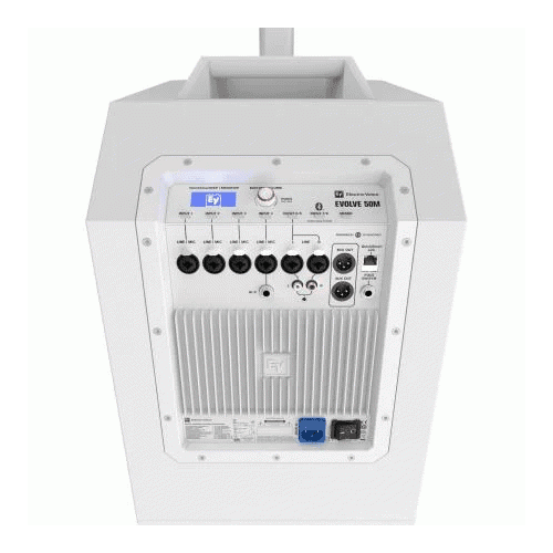 Het Electro-Voice Evolve 50M speaker-zuilsysteem bestaat uit een 12 inch subwoofer, tussenpaal en een zuilopstelling die is verdeeld over acht 3.5 inch neodymium drivers. Deze opstelling resulteert in een extreem brede spreiding (HxV: 120° x 40°) zodat zowel het zittende als het staande publiek volledig van de output kan genieten. De 8-kanaals mixer is uitgevoerd met professionele preamps en mix-functionaliteit. Ook kan je draadloos via Bluetooth verbinding met de mixer maken om audio in hoge resolutie draadloos te streamen. Onafhankelijke aux sends en voetschakelaars bieden de mogelijkheid voor het toevoegen van externe effecten aan de mix. Ten slotte is het mogelijk om twee Evolve 50M’s te combineren door ze te linken met een simpele internetkabel om zo de aansluitmogelijkheden en mix-aansturing via de QuickSmart Mobile app te combineren.