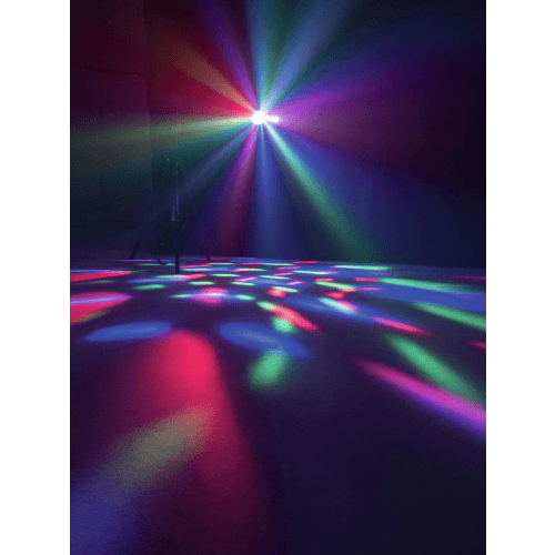 Een roterende spiegelbol met vier LED’s wervelt schitterende RGBW-kleuren door de kamer, terwijl 32 extra LED’s zorgen voor stroboscoopeffecten, achtervolgingen en meer. Kleine lichtpuntjes van twee laserdiodes vormen een groot contrast met deze zee van kleuren. Voor de bediening kun je vertrouwen op de vier vooraf ingestelde programma’s of je gebruikt de meegeleverde IR-afstandsbediening om aanpassingen te doen.