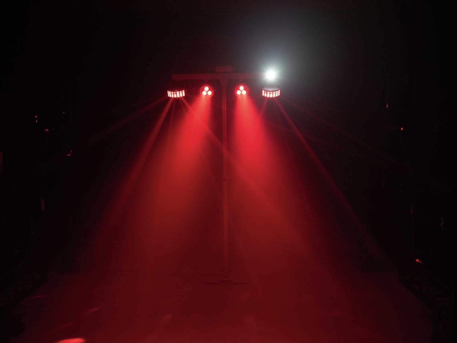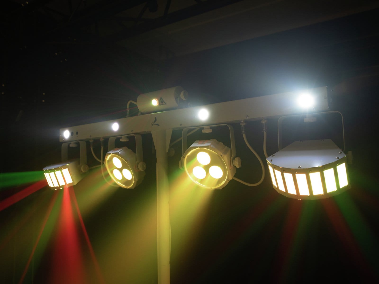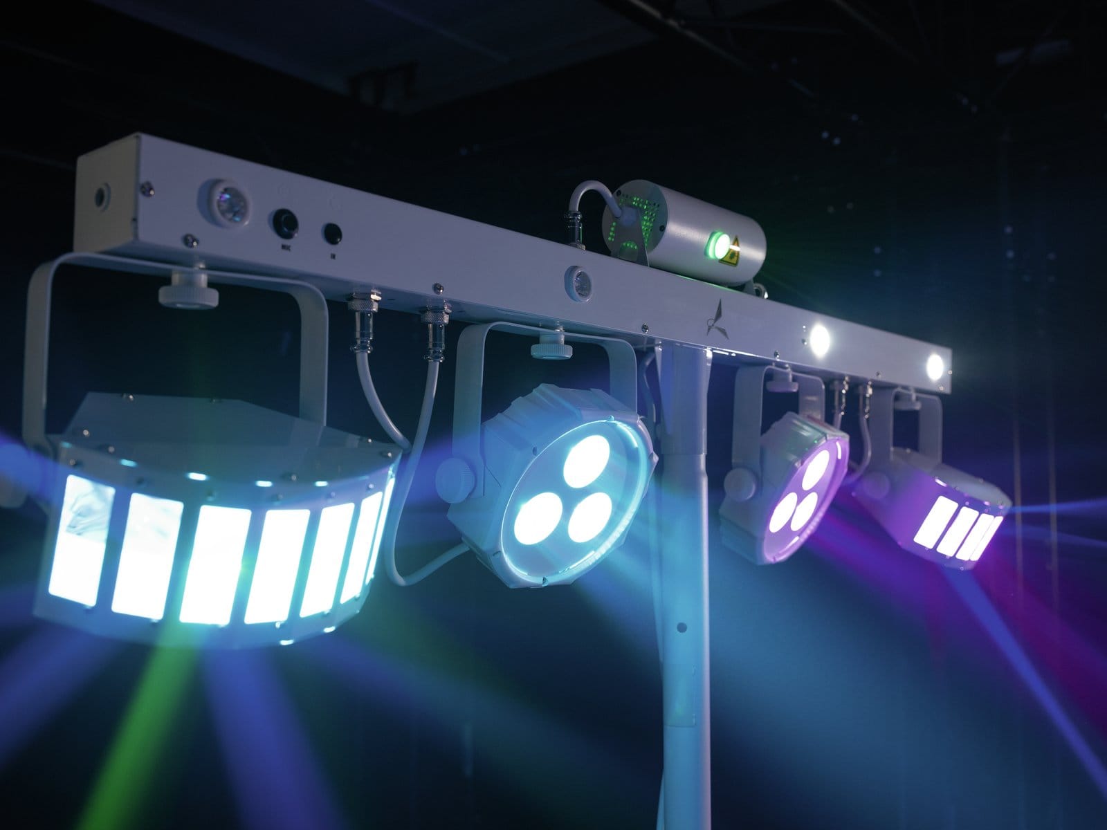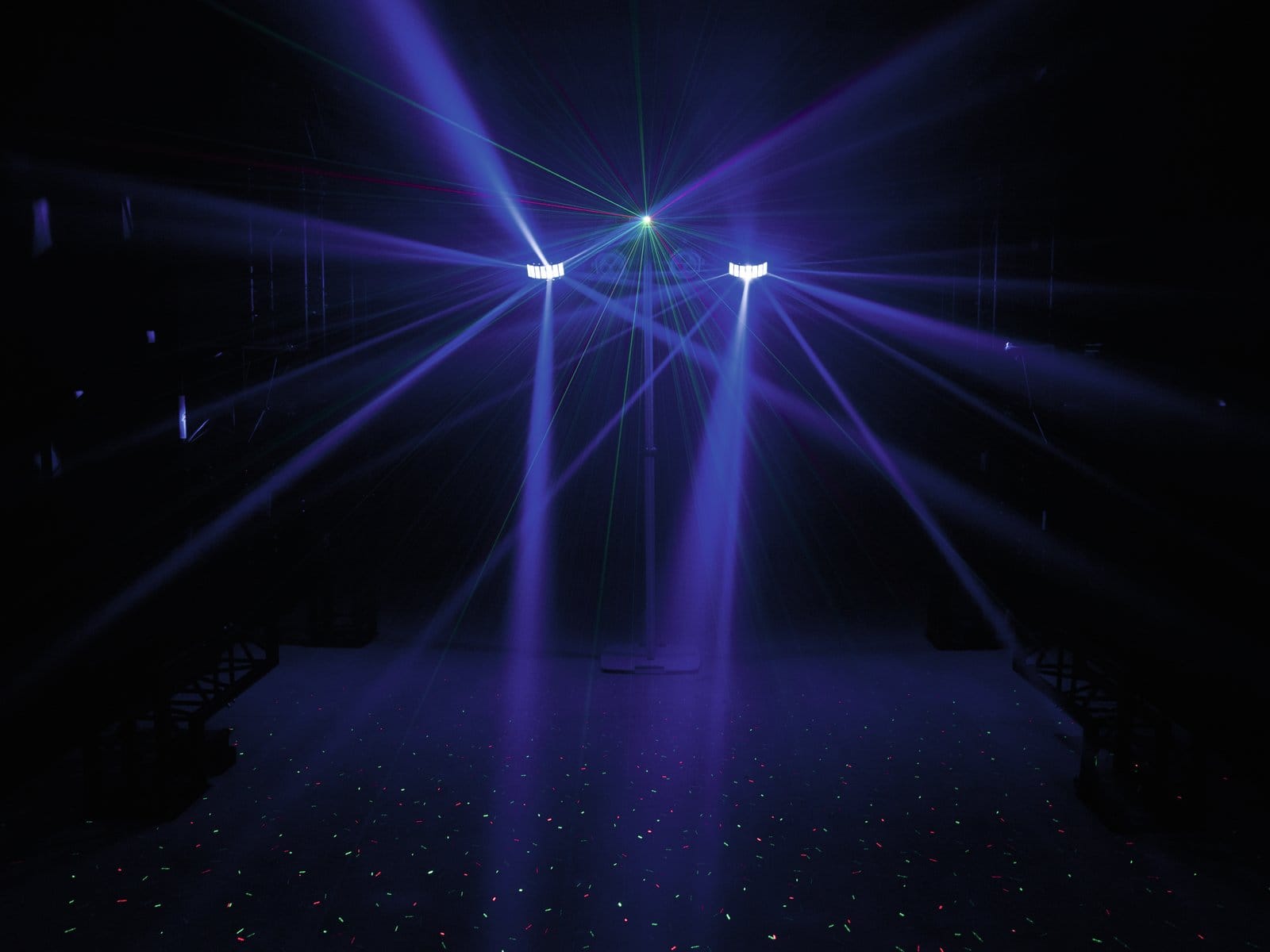 Bar met 2 derby’s, 2 spots, witte stroboscoop-LED’s, laser (RG, 2M), voetschakelaar