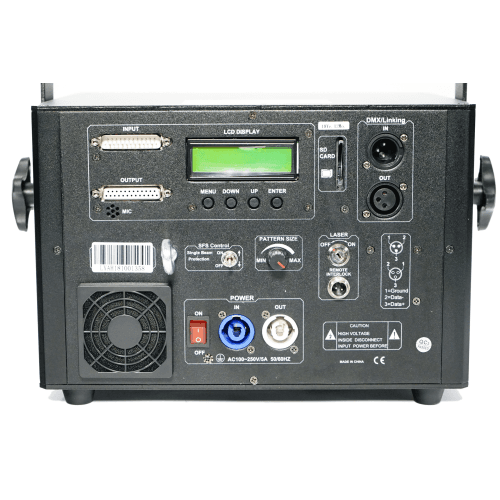 Professionele RGB-animatielaser met volledige diode, R:400mW + G:500mW + B:1600mW analoge modulatie (totaal 2,5W), R: 635nm+G: 520nm+B:450nm, scanner25KPPS, ±20°