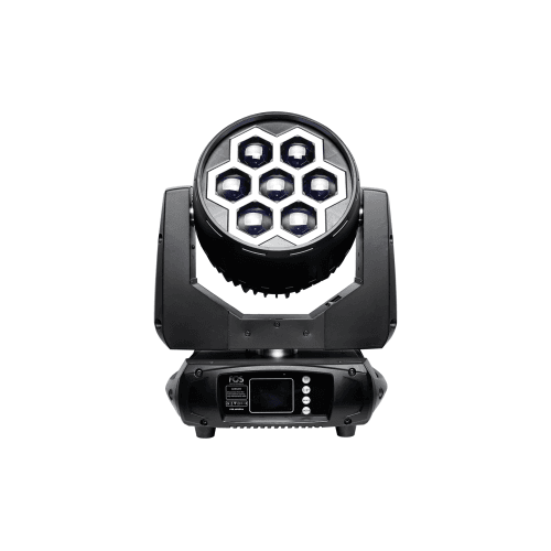 Super Bright Beam/Wash-movinghead, 7 leds 40 watt 4in1 RGBW, 7 pixelbedieningsringen, 6-60° elektronische zoom, grafische effectmacro’s, 0-100% lineaire dimmer, powercon in/uit.