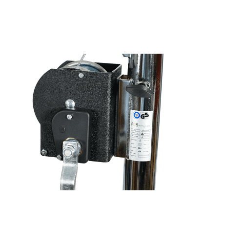 Opwindstandaard met één telescopische poot, TUV-gecertificeerd, hoogte: 2,2 – 4 m, maximaal draagvermogen: 85 kg, 35 mm topmontage, transportafmetingen: 1,75 m, gewicht: 25 kg.