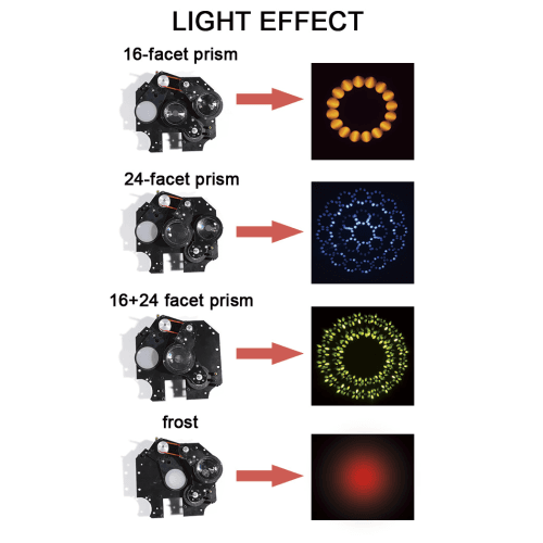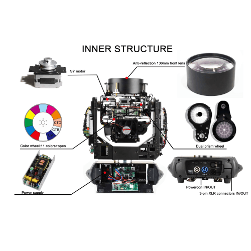 Professionele straal met superprisma’s (prisma met 16 facetten + 24 facetten) en krachtige, ultraheldere OSRAM 7R-lamp (2000 uur), 3-fase P/T-motoren, massieve stralingshoek: 2,5°, anti-reflectie 136 mm frontlenzen, controlekanaal: 14/16 DMX, 11 kleuren, 16 gobo’s, Frost-filter, Gemotoriseerde focus van dichtbij tot ver (2,5 M-30 M), 13,2 kg.