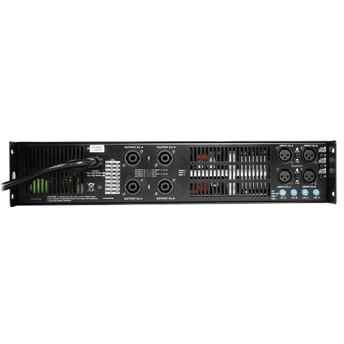 D-klasse hoogwaardige 4-kanaalsversterker, 4 x900 w/8ohm, 4 x1800w/4 ohm, XLR-ingang, speakon-uitgang, led VU-meter, temperatuurregelingsventilatoren, frequentierespons 20Hz – 34Kz, verstelbare VPL, 10kg.