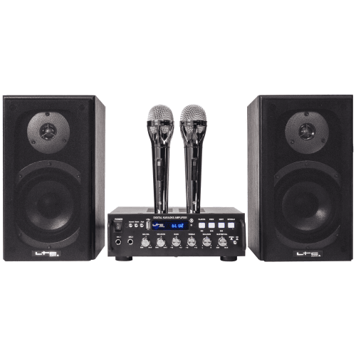 Plug & Play karaoke set met USB & Bluetooth digitaal versterker, 2 microfoons, een paar 13cm luidsprekerboxen en 2x 5m lange luidsprekerkabels.