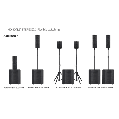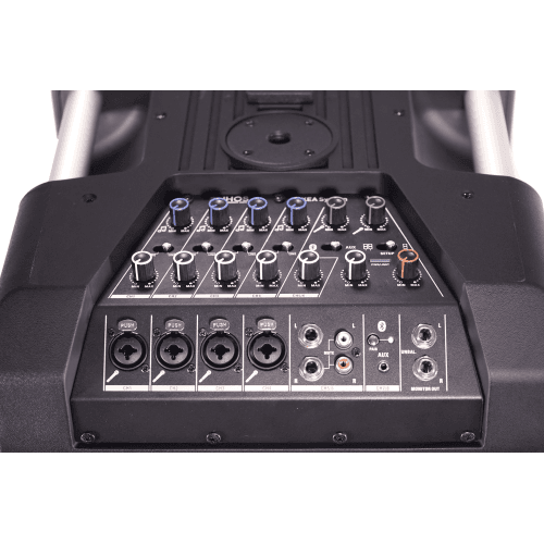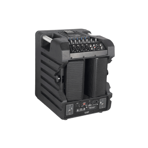 Draagbaar PA-kolomsysteem, lichtgewicht en boordevol functies. luidspreker 2 x 4? HF, 1x 10?SUB, 123 dB SPL, 255W (sub)+60w (sat), Duitse techniek klasse D-versterker, frequentierespons 50-20kHZ, interne 6-kanaals mixer met echo- en vertragingseffecten en Bluetooth.