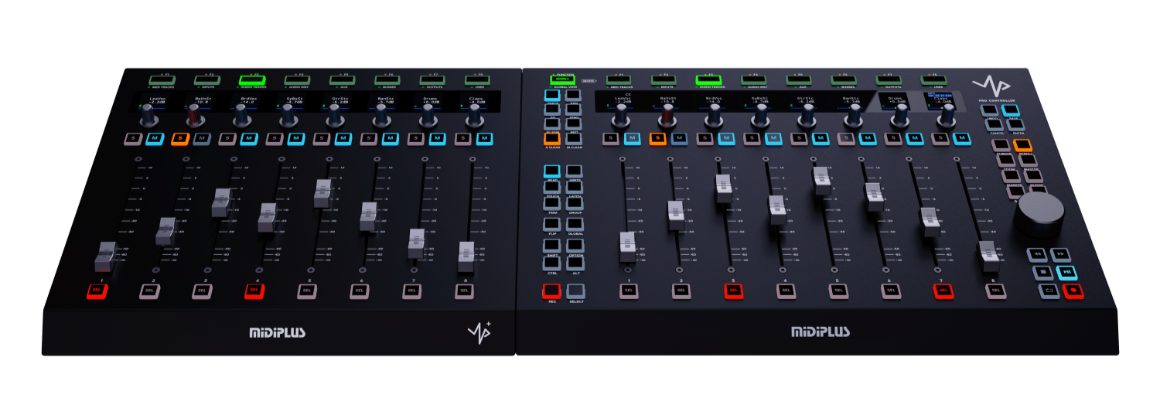 De Midiplus Up is een handige DAW controller met acht kanalen, voorzien van motorfaders, encoders en displays. En een mastersectie met jogwheel en de functietoewijzing van de faders. Die Up is echter uit te breiden, daartoe dient deze Midiplus Up+ expander. In feite hetzelfde apparaat, maar dan minus de mastersectie, die heb je ook niet nodig aangezien de mastersectie van de Up die rol al op zich neemt. In totaal kun je je Up-console uitbreiden tot 32 kanalen, hetgeen impliceert dat je dan één Up en driemaal een Up+ hebt.
