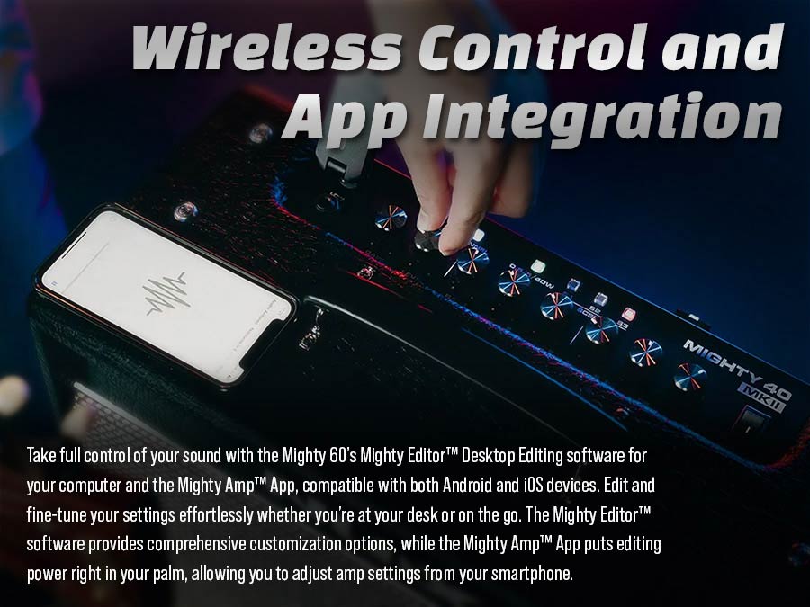 Met 21 iconische versterkermodels, 43 aanpasbare effecten (verdeeld over volledig routerbare blokken), 7 gebruikerspresets en 3 Pro Scenes per preset, biedt de Mighty 40 MKII eindeloze klankmogelijkheden. De Patch Level-functie zorgt voor consistente volumes tussen presets, ideaal voor live gebruik. Dankzij de meegeleverde Bluetooth-module kun je draadloos bedienen via de MightyAmp™ app of Mighty Editor™ software. Verder beschikt de amp over een 60-seconden looper met automatische tempodetectie, drumcomputer, FX-loop, USB audio-interface, lijnuitgang en nog veel meer.