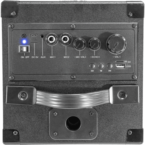 Actieve luidsprekerbox met batterijvoeding, speciaal ontworpen voor karaoke-doeleinden, geleverd met microfoon en standaard.
