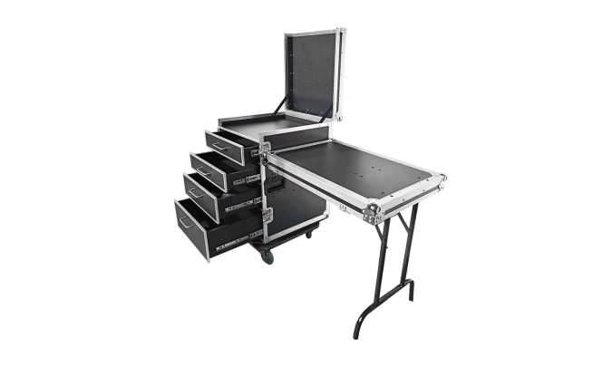Een flightcase, maar eentje die je als gereedschapskoffer kunt gebruiken, dat is de Prodjuser DC 4 On the road. De DC4 is gemaakt met het oog op mobiliteit en praktische inzet. Zo kun je het zijpaneel afnemen en gebruiken als werktafel vanwege de aanwezigheid van een inklapbare poot. Er zijn 4 uitschuifbare lades van verschillende grootte aanwezig en daarnaast vind je aan de bovenkant een extra vast compartiment. Bij het laatste kun je het paneel ook openklappen voor nog meer ruimte. De Prodjuser DC 4 rust op zwenkbare wielen waardoor verplaatsing altijd moeiteloos verloopt. Er zijn locks aanwezig zodat de koffer ook netjes op zijn plaats blijft staan. Wat betreft kwaliteit, daar staan Penn Elcom onderdelen en speciaal hout voor garant.