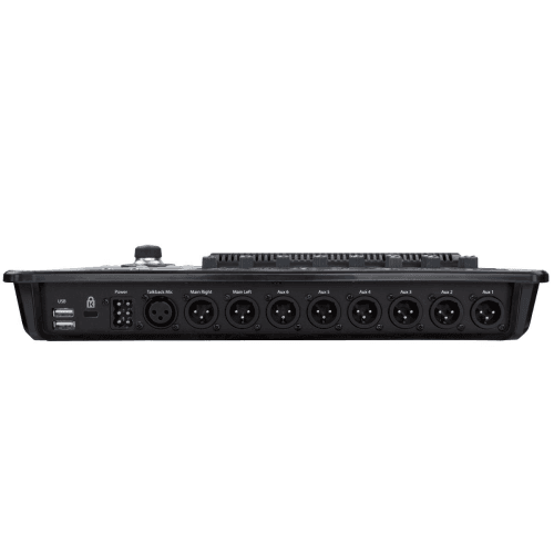 16 uitgangen: Stereo Main XLR, 6 aux XLR, 2 stereo aux-jack-aansluiting, 1 stereo cue jack, 1 stereo jack monitor