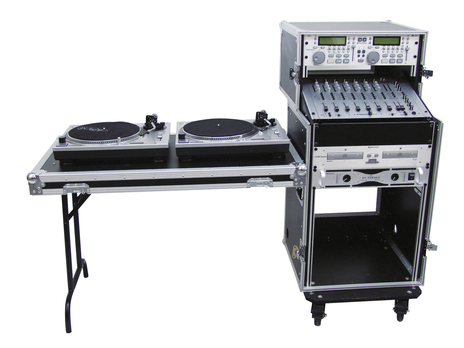 Professionele oplossing voor een complete DJ-setup Afneembare frontplaat met opklapbare tafelpoot, geschikt voor twee draaitafels