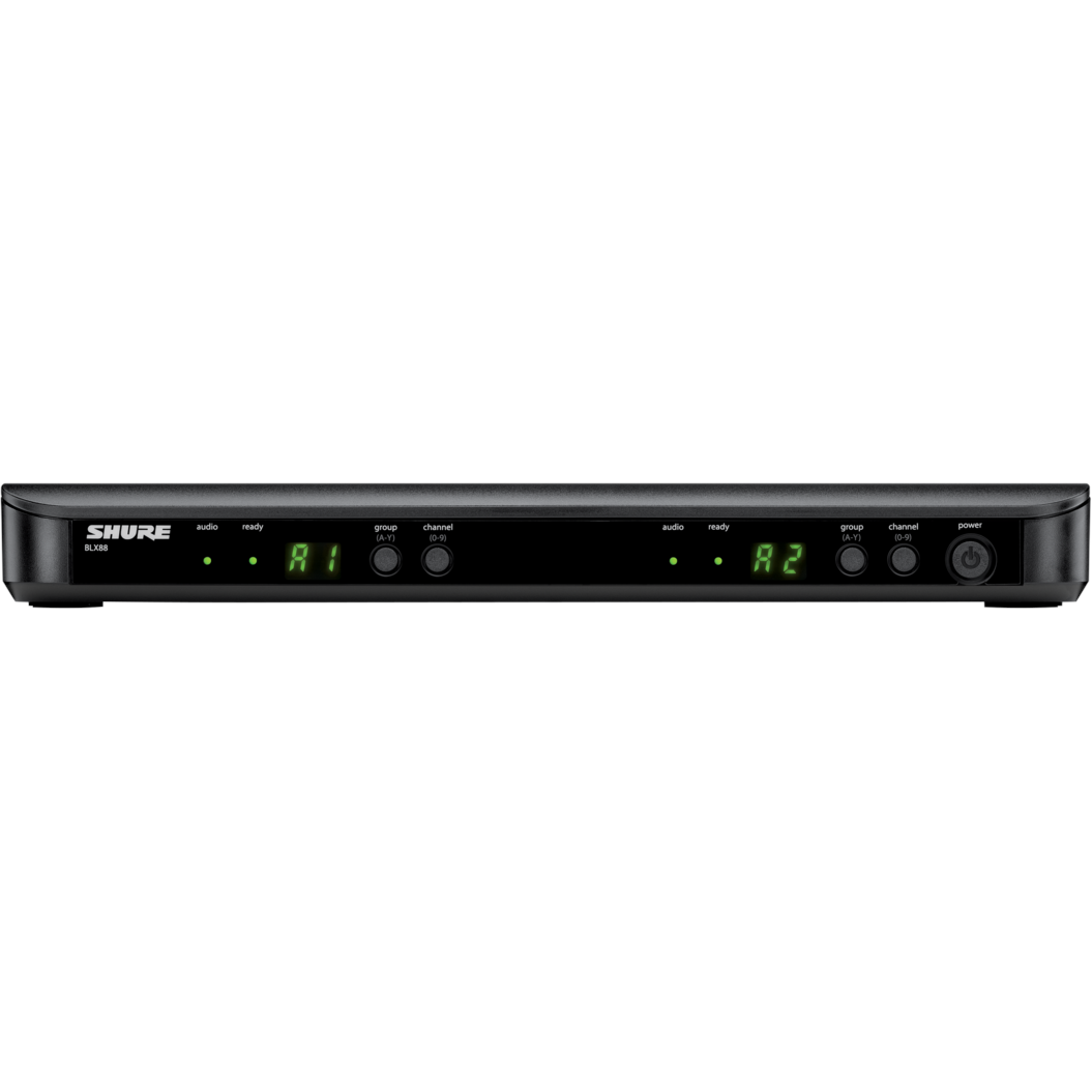 De Shure BLX88 ontvanger is een dubbel uitgevoerde versie van de Shure BLX4. Hij is voorzien van krachtige geïntegreerde antennes, waardoor je niet eindeloos hoeft te draaien en bij te stellen in de hoop dat het de ontvangst verbetert. Zelfs op een afstand van zo’n 90 meter ontvangt de BLX88 nog steeds het signaal van de headset en handheld microfoon. Dankzij het QuickScan-systeem heb je razendsnel de juiste kanalen te pakken en is de set vervolgens gereed voor gebruik.