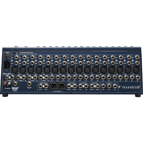 Ingangs/uitgangskanalen en geluidskwaliteit zijn dé twee sleutelwoorden in een studio. En laat Soundcraft nu precies aan die twee eisen voldoen. De mixer heeft maar liefst zestien ingangskanalen die bestaan uit XLR en 6.3 mm jack. Ook heeft de mixer vier stereo returns waarmee het mogelijk is om effectapparatuur aan te sluiten. Eigenlijk heb je dit niet nodig omdat de mixer zelf al is voorzien van een 24-bit effectenbak die zeer hoogwaardige effecten neer kan zetten. Deze effecten zijn met drie draaiknoppen naar uw eigen wens aan te passen en als je volledig tevreden bent kunt je de instellingen ook opslaan om ze later terug te roepen.