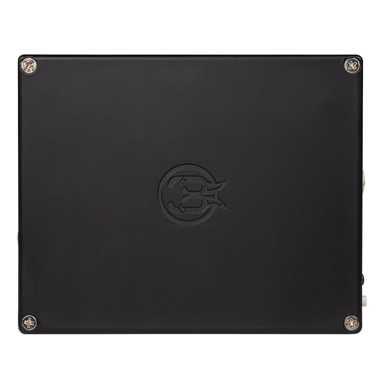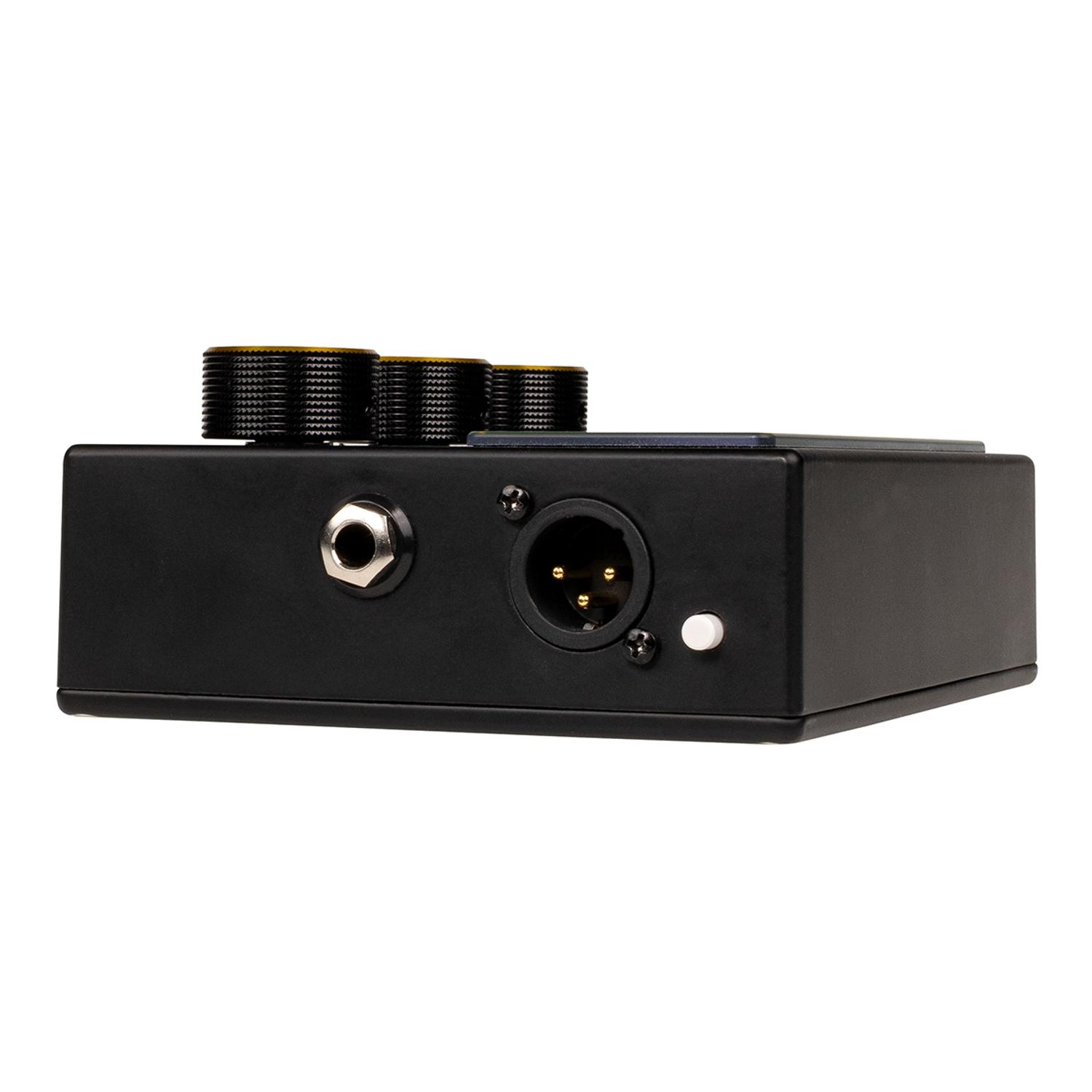1/4″ TS ongebalanceerde Hi-Z-ingang, geoptimaliseerd voor elektrische basgitaren, gebufferd door een hoogwaardige JFET-trap. 1/4″ TS ongebalanceerde uitgang voor versterkers of extra pedalen. Mannelijke XLR-uitgang met transformatorbalans voor hoogwaardige DI-tonen. Voeding: 9V DC (500 mA, midden-negatief), intern versterkt tot +24V voor een enorme headroom.