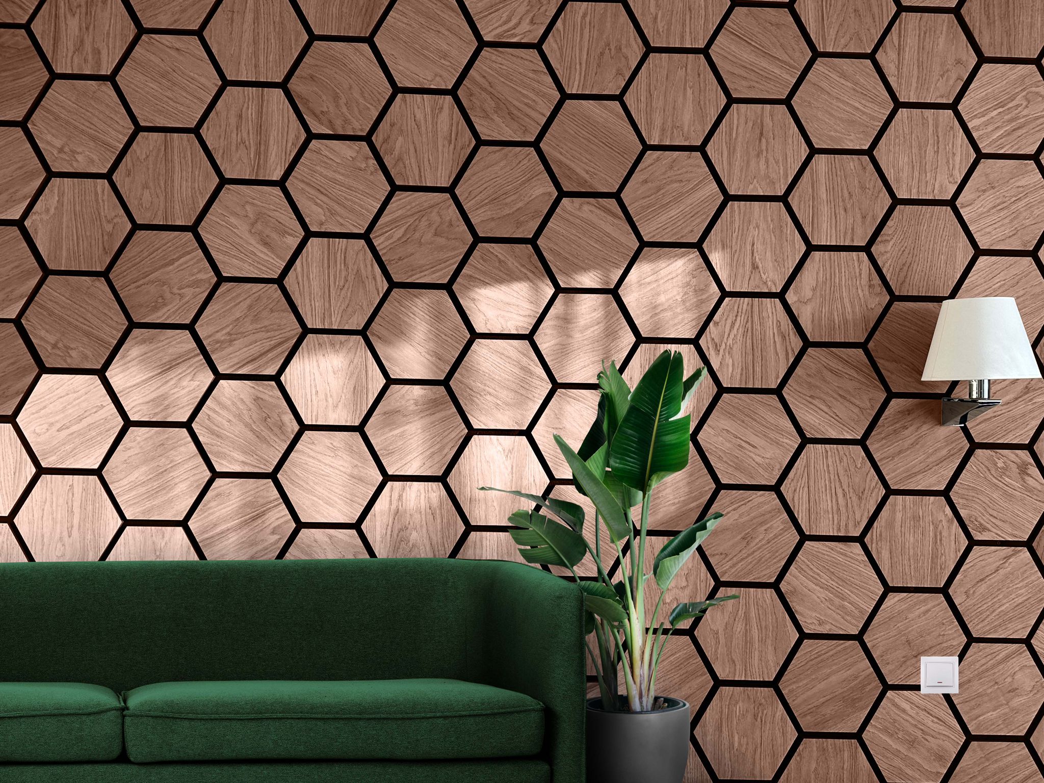 - De hexagon wandpanelen hebben een breedte van 62 cm en een lengte van 76 cm. Dikte is 2,2 cm en de naadgrootte is 1,5 cm.De combinatie van het vilt met het hout zorgt ervoor dat de wandpanelen een geluidsabsorberende functie hebben.